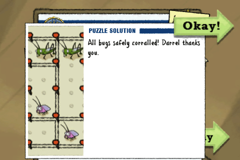The variety of puzzles is worth pointing out. They include logic, matching, jigsaw puzzles, and planning routes, among others. Of course, some of these are more successful than others: The pieces of the jigsaw puzzles automatically snap together if the player moves them close to each other, and so moving them around randomly is usually easier than trying to look for patterns in the jumbled mess crammed into an iPhone screen. (One end-game puzzle involves creating a pattern that has space between the pieces. I have no idea how this would be solvable if the hadn’t done it all for me.) Some logic puzzles (“if a blind man has 5 patterns of socks, how many must he take to ensure a matching pair?”) weren’t challenging back in elementary school; others, such as the more complex route-creation ones, did feel worth my time. But overall, most puzzles were so disappointing that it wasn’t even exciting when I found a new one. It certainly doesn’t help that to “submit” the answer to a puzzle, the player must sit through the same 19 seconds of animation each time. I can’t imagine that anyone thought these animations would be interesting more than once, so I have to conclude that this is a stalling tactic to make the game feel longer.