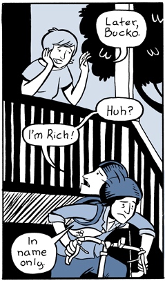 I can’t discuss Gingerbread Girl without mentioning the website’s interface. Unfortunately, this is not up the the standards of the comic itself. Top Shelf’s webcomic presence (“Top Shelf 2.0”) is a marketing tool to stir up interest in the eventual print books, and so it’s unsurprising that it feels like an afterthought. Each two-to-three-page installment of Gingerbread Girl is posted separately, and the buttons that take you forward and back through the pages only work within that installment. If you followed my link to the start of the Gingerbread Girl story, chances are that you hit “Next” after page three, saw the pop-up window informing you that that was the last page, and assumed you were all caught up with the comic. Not true at all! I wonder how many people have had their interest piqued by the story’s opening but never figured out that it was still updating. To get to the other installments, you need to choose an episode from the “See Also…” drop-down menu, or from the list on the creator page. (Or you can subscribe to the RSS feed, but that lists every comic that Top Shelf 2.0 publishes even if you only care about this one!) That isn’t too awkward now, with only five installments to the story, but if it’s going to expand into a full-size novel, navigating the list of episodes will become more problematic. I’m not even sure if the “See Also…” list will keep the entire set of chapters, or if it’s restricted to a few “most relevant” ones.